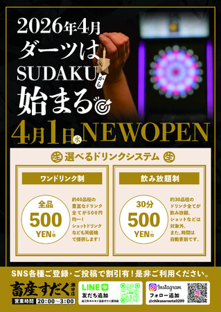 株式会社総合近江牛商社(本社:滋賀県、代表取締役:西野立寛)は、2026年4月1日(水)、滋賀県大津市・瀬田駅前にて「ダーツバーSUDAKU」をオープンいたします。