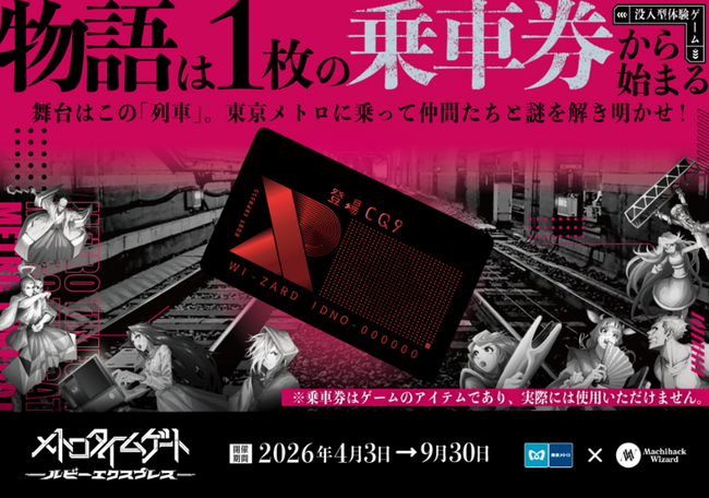 東京地下鉄株式会社(本社:東京都台東区、代表取締役社長:小坂 彰洋、以下「東京メトロ」)は、地域コンテンツを軸にした体験型サービス「街ハック!」を展開する株式会社休日ハック(本社:東京都台東区、代表取締役社長:田中 和貴、以下「休日ハック」)と共同で、没入型体験ゲーム『メトロタイムゲート』の完全新作となる「ルビーエクスプレス」編を、2026年4月3日(金)から同年9月30日(水)の間、期間限定で開催します。