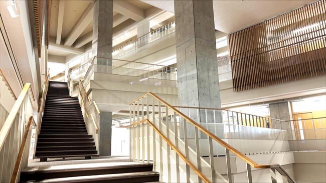 新校舎の特徴は、施設中央に配置された4層吹き抜けの共用空間です。休み時間の交流や活動成果の発表、授業など多様な用途に活用できる空間として設計されており、学年を越えた生徒同士の交流を促す場となります。吹き抜け空間はフロアごとに位置をずらす構成とし、千里山キャンパスの丘陵地形をイメージした立体的な空間構成となっています。