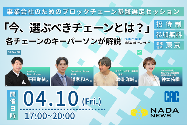 N.Avenue株式会社(本社:東京都港区、代表取締役社長:神本侑季)は、株式会社シーエーシーの協賛により、Web3活用を検討する企業に向けて、最適なブロックチェーン基盤の選定基準を提示する完全招待制ワークショップ「今、選ぶべきチェーンとは? ──事業会社のためのブロックチェーン基盤選定セッション」を、2026年4月10日(金)に開催します。