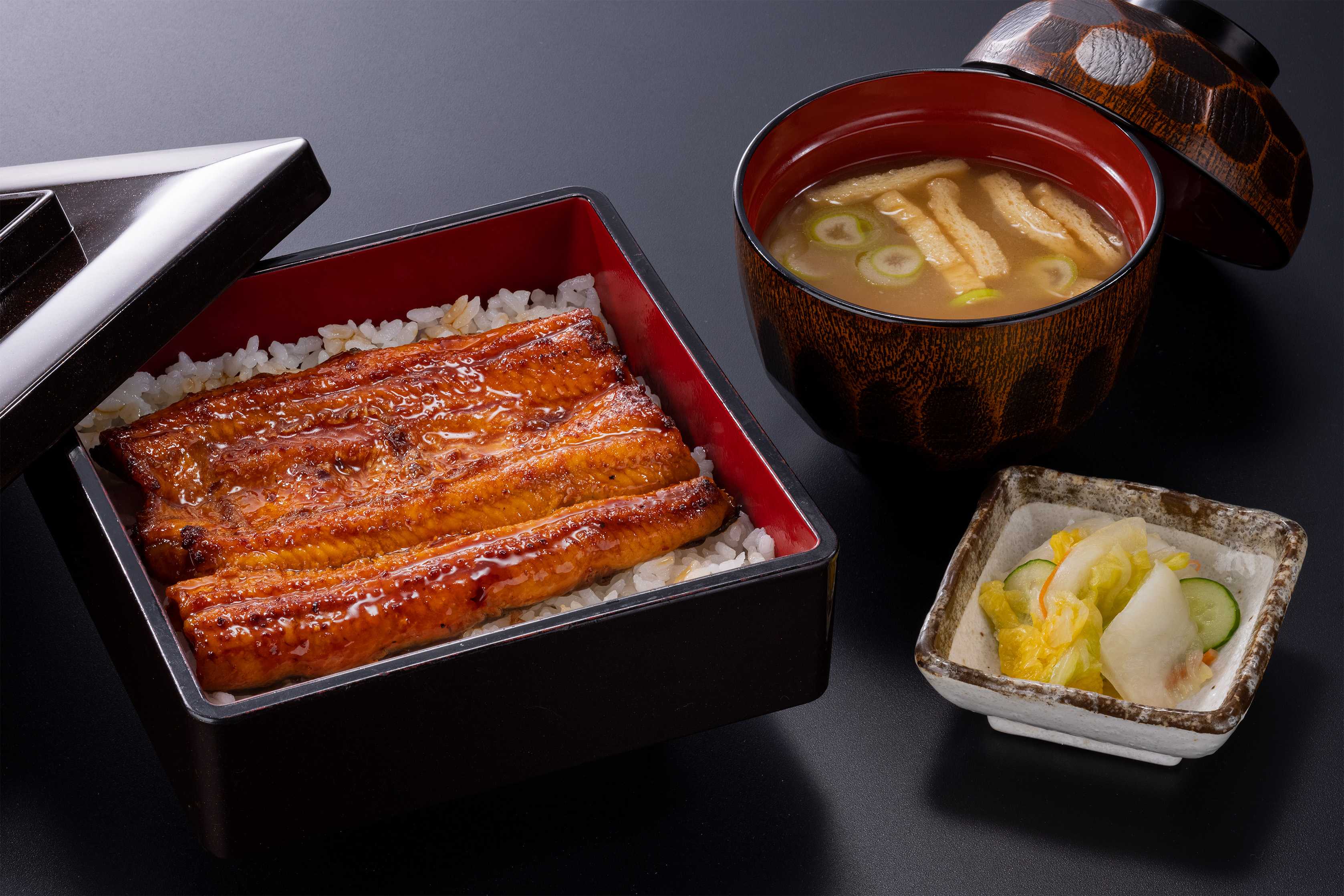 肉厚のうなぎをふっくら香ばしく焼き上げ、うなぎ本来の美味しさをぐっと引き立てる“特製のタレ”につけ、炊きあがり時間を徹底管理したごはんの上にのせて提供いたします。セットでご用意する、漬物・みそ汁と一緒にご堪能いただけます。