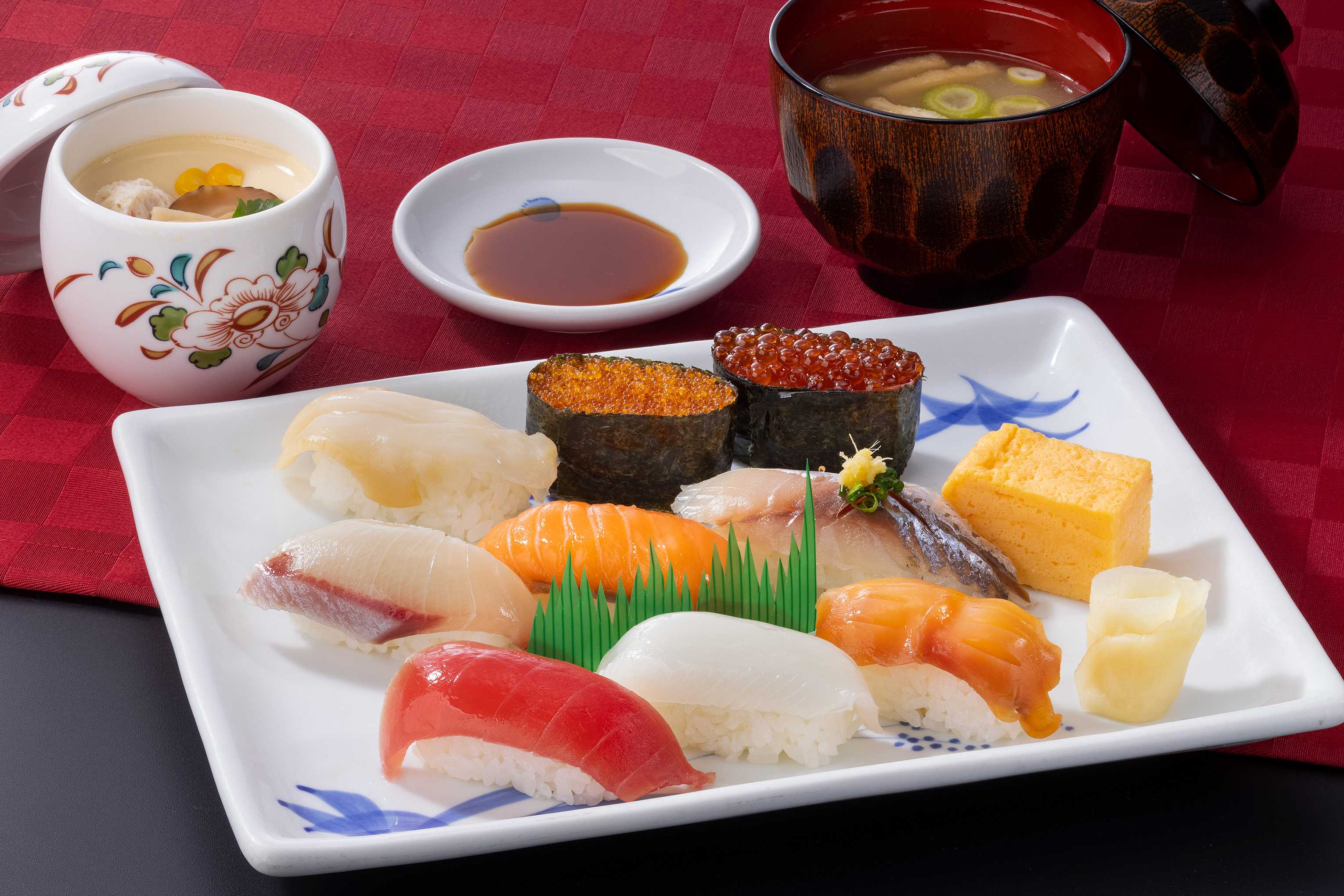 まぐろ・サーモン・赤貝・いくらなど、とんでん自慢の鮨9貫に、茶わんむし・みそ汁をセットにした「とんでん」。滑らかな食感が自慢の“茶わんむし”は、北海道産の卵とたっぷりのだしを使用しています。
