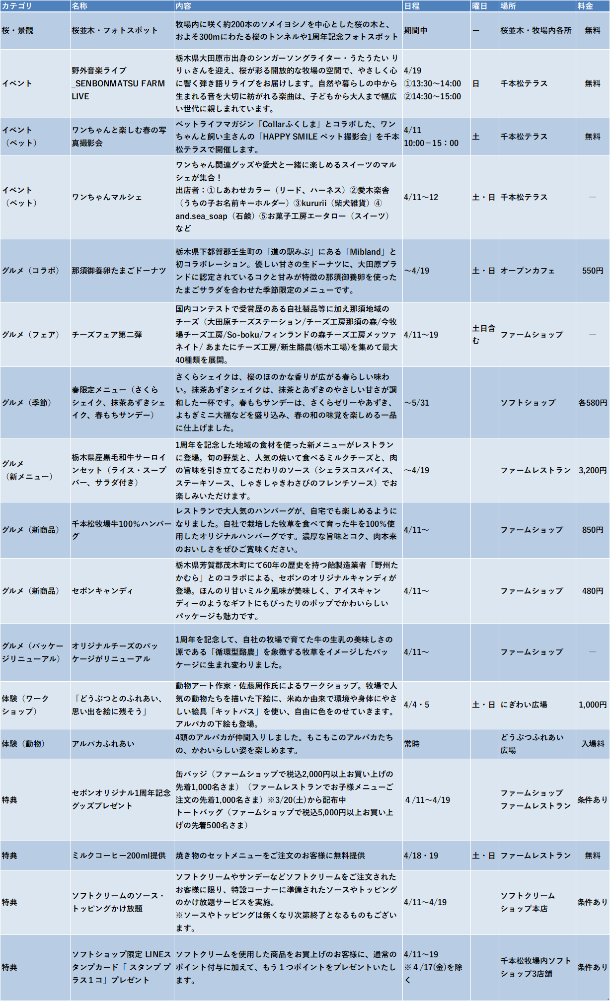 ・主な内容:桜の景観演出、1周年記念フォトスポット、新商品発売、地域連携の食企画、春限定メニュー、栃木県出身アーティストの野外音楽ライブ(無料)、どうぶつふれあい広場にアルパカ仲間入り、ペットと飼い主さまの写真撮影会(無料)、どうぶつアートなどの参加型イベント
