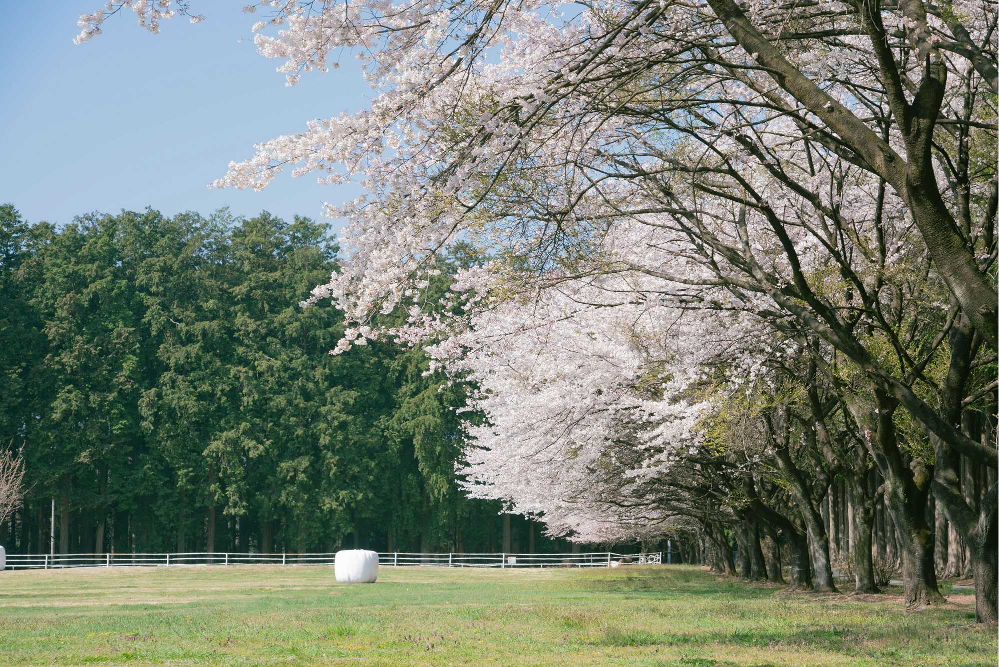 ■見どころ①:およそ300メートルにわたる桜のトンネル×牧場の開放的なお花見体験&フォトスポット
