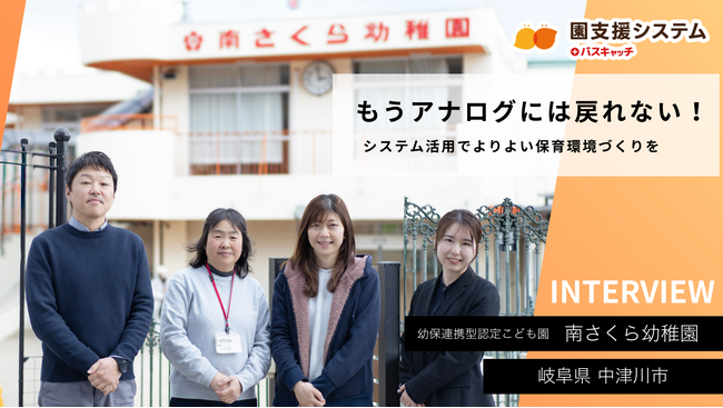 幼保連携型認定こども園 南さくら幼稚園(所在地:岐阜県中津川市、園長:馬場 啓子先生)は、2024年6月よりVISH株式会社の「園支援システム+バスキャッチ」を導入。ICT化前の課題と、システムの導入効果について、南さくら幼稚園の担当者に取材した導入事例記事を公開しました。