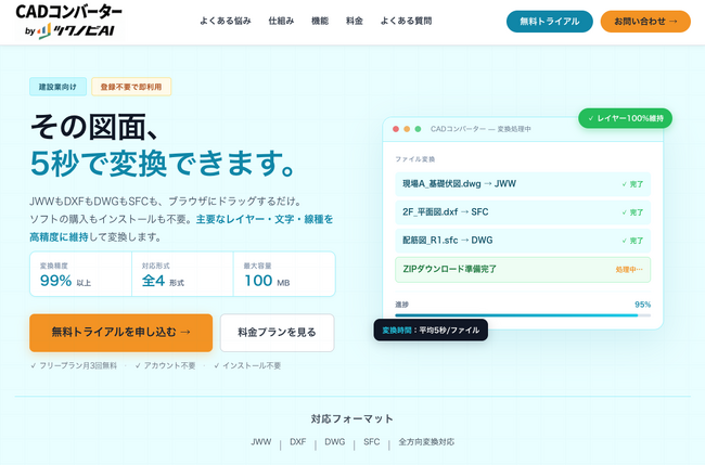 JWW・DXF・DWG・SFC全方向変換に対応。ブラウザ完結・インストール不要で、フリープランは月3回まで無料