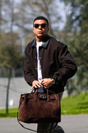 2026年3月23日、クレールフォンテーヌ国立研究所にフランス代表チームとともに到着した、キリアン・エムバペは、ディオールのレザーカラー付きブラウンコットンジャケットを着用し、ブラウンのスエード「ディオール ノルマンディ」バッグを合わせました。