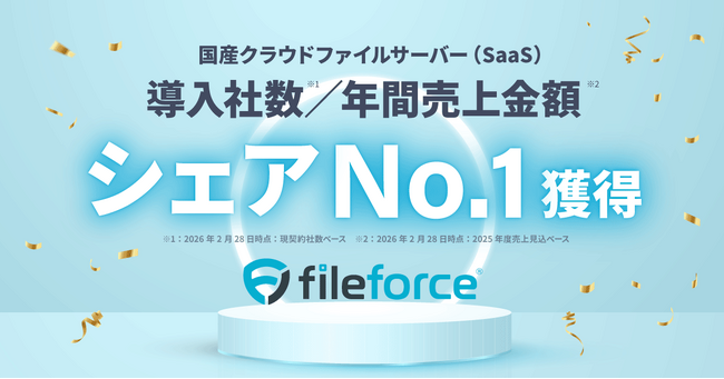ファイルフォース株式会社(本社:東京千代田区 代表取締役:サルキシャン アラム)は、提供する純国産クラウドストレージ「Fileforce」において、当社委託の第三者調査機関(株式会社未来トレンド研究機構)「国産クラウドファイルサーバー(SaaS)に関する市場調査 2025」において、「導入社数シェアNo.1」※1および「年間売上金額シェアNo.1」※2 を獲得したことをお知らせします。
