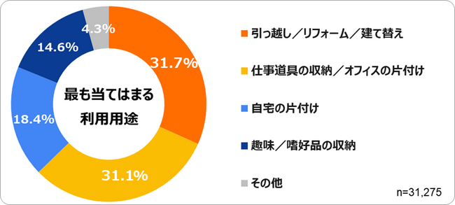 利用用途については、「引っ越し/リフォーム/建て替え」(31.7%)が最多となり、「仕事道具の収納/オフィスの片付け」(31.1%)が僅差で続きました。さらに、「自宅の片付け」(18.4%)や「趣味/嗜好品の収納」(14.6%)といった回答も見られ、幅広いシーンで利用されていることが分かります。一方、「その他」は4.3%となりました。