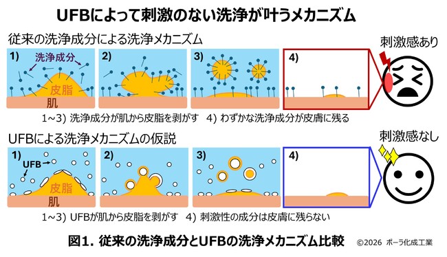 本論文の中で、小林研究員は高濃度のUFBを化粧品に安定して存在させることのできる剤型技術を発表しました。パッチテストで刺激性がないことも確認し、刺激性物質を肌に残さない洗浄用化粧品の実現が可能であることを示唆しました(図1)。