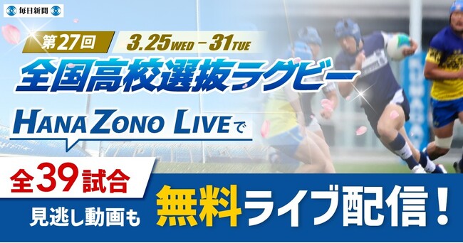 第27回全国高等学校選抜ラグビーフットボール大会(日本ラグビーフットボール協会主催、毎日新聞社など後援)=以下選抜大会=が3月24日、埼玉県熊谷市で開幕します。毎日新聞社は、25日から実施される全39試合を高校ラグビー公式サイト「HANAZONO LIVE」で無料ライブ配信します。試合後は見逃し動画も無料で配信。新2、3年生が挑む新チーム最初の大舞台をぜひご覧ください。