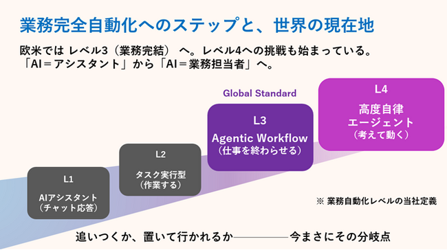 近年、企業の業務プロセス自動化は、世界的に「L1~L4」へ段階的に高度化しています。現在、日本国内ではL1~L2レベルのAIエージェント活用が主流であり、AIエージェントの自律的な意思決定が業務全体に関係してくるL3~L4への移行が大きな課題となっています。最大の障壁は、実務に必要な判断基準・例外処理・前提条件などの業務知識が未構造化のまま暗黙知として存在し、業務担当者・責任者の頭の中に依存したまま残っていることです。