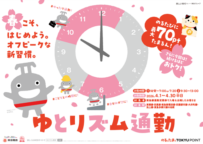 当社は、2026年4月1日(水)から4月30日(木)までの期間限定で、快適な通勤を体感いただくために、朝のピーク時間帯を避けてご乗車いただいた方にTOKYU POINT※1を加算するサービス「春こそ、はじめよう。ゆとリズム通勤」(以下、本サービス)を実施します。