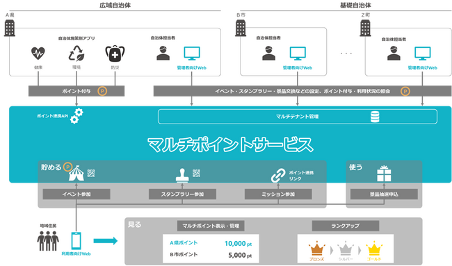 「マルチポイントサービス」は、県や市町村など複数の自治体ポイントを単一基盤で統合することを可能にした、Webアプリ方式のマルチテナント型ポイント基盤サービスです。