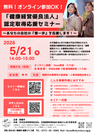 舞鶴市は令和8年5月21日(木)、市内事業所の経営者や人事労務担当者を対象に「『健康経営優良法人』認定取得応援セミナー」をオンラインおよび中総合会館で開催します。