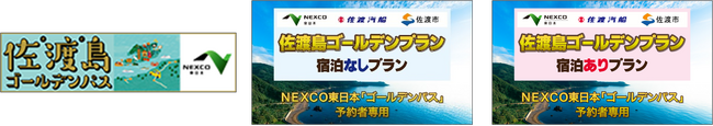 NEXCO東日本ホームページで「佐渡島ゴールデンパス」を予約し、予約番号取得後に佐渡汽船(株)ホームページから「佐渡島ゴールデンプラン」を予約してください。