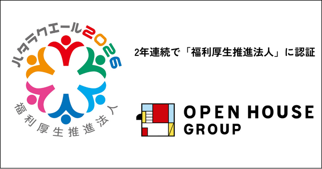 株式会社オープンハウスグループ(本社 東京都千代田区、代表取締役社長 福岡 良介、以下「当社」)は、福利厚生の充実に力を入れる法人を表彰・認証する制度である「福利厚生表彰・認証制度(ハタラクエール2026)」において、2年連続で「福利厚生推進法人」に認証されました。さらに本年は、当社に加えて中核事業を担うグループ会社である株式会社オープンハウスおよび株式会社オープンハウス・ディベロップメントの2社も新たに同認証を取得いたしましたので、下記のとおりお知らせいたします。