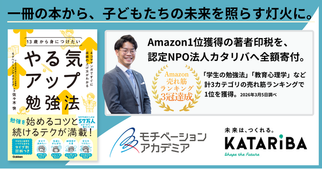 株式会社リンクアンドモチベーション(本社:東京都中央区、代表:小笹芳央、証券コード:2170)のグループ会社で学習塾事業を行う株式会社モチベーションアカデミア(本社:東京都中央区、代表:佐々木 快)は、2026年3月5日に発売し、Amazon売れ筋ランキング3カテゴリで1位を獲得した新刊『13歳から身につけたい やる気アップ勉強法』(Gakken)の著者印税の全額を、認定特定非営利活動法人カタリバ(本部:東京都中野区、代表理事:今村久美、以下「認定NPO法人カタリバ」)へ寄付することをお知らせいたします。