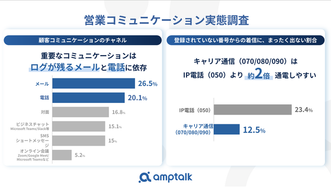 商談データを資産に変え、営業組織の成長を支援するamptalkは、日本企業におけるコミュニケーションチャネルの選択実態と、番号種別(携帯番号 / IP電話番号)による応対率の差を明らかにすべく、「営業コミュニケーション実態調査」を実施いたしました。ビジネスの重要局面で選ばれるチャネルを特定し、営業コミュニケーションの最適化に向けた示唆を考察しています。特に、4月の新年度を前に、通信環境というインフラ側の不備が、新人の自信喪失や「孤立」を招く一因となり得ることを示唆し、データに基づいた健全な組織づくりを検討するための指針を提示することを目的としています。