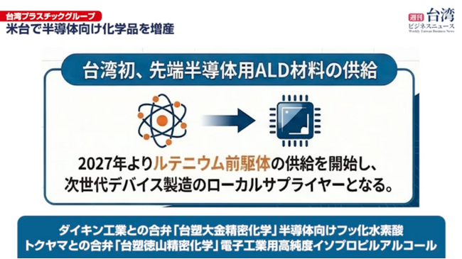 台湾塑膠工業(台塑)をはじめとする台プラグループは、TSMCの増産計画に合わせて半導体向け化学品などの材料を増産します。汎用品事業を縮小し、高付加価値製品への転換を図る5カ年計画を始動。米国テキサス州での電子工業用塩酸製造工場(2028年末稼働予定)の増設や、台湾国内でのダイキン工業、トクヤマとの合弁による高純度フッ化水素酸(HF)、高純度IPAなどの生産能力拡大を進めます。