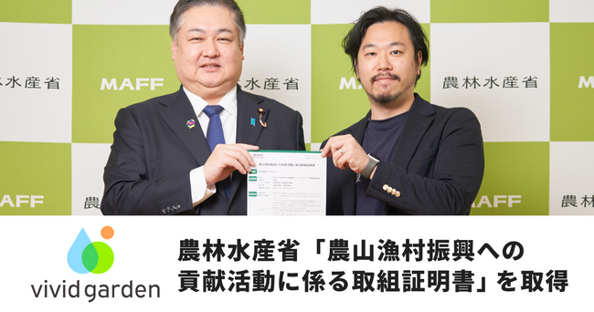 ビビッドガーデン、農林水産省「農山漁村振興への貢献活動に係る取組証明書」を取得