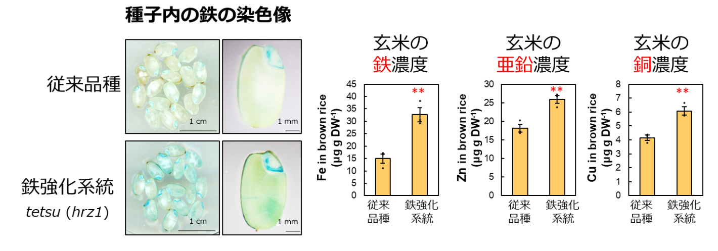 また本変異体は有害重金属(カドミウムなど)の過剰蓄積は見られない上に、鉄の取り込みが強化されているために鉄欠乏が生じやすいアルカリ土壌条件でも生育が維持されることを明らかにしました。このtetsu変異体は育種利用も可能で、本研究内では黒米品種との交配により、鉄含量の増加のみならず、高い抗酸化効果が報告されている複数のポリフェノール類を玄米中で同時に増加することに成功しました。