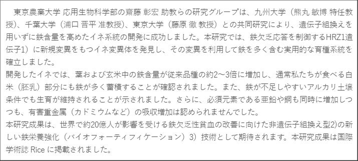 - 【東京農業大学(共同研究)】遺伝子組換えを使わず、鉄を多く含むコメの開発に成功 ~鉄欠乏性貧血対策につながる新しい育種技術~03/25 10:00