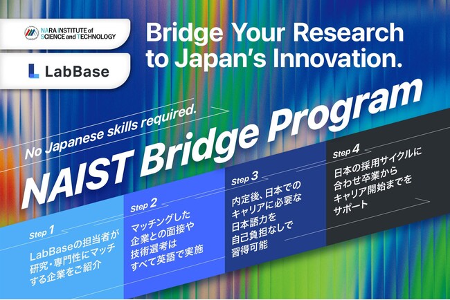 株式会社LabBase(本社:東京都港区、代表取締役CEO 加茂倫明/以下「LabBase」)は、2026年3月25日(水)、奈良先端科学技術大学院大学(所在地:奈良県生駒市、学長:塩崎一裕/以下「NAIST」)と連携し、NAISTに在籍する理系修士・博士留学生の日本国内企業への就職を支援するプログラム「NAIST Bridge Program」を開始します。