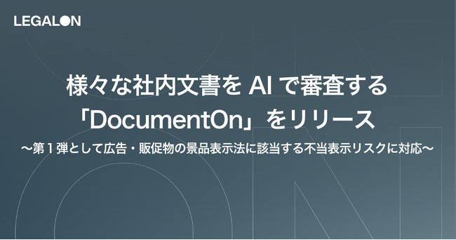 株式会社LegalOn Technologies(本社:東京都渋谷区、代表:代表取締役 執行役員・CEO 角田 望)は、様々な文書をAIで審査する「DocumentOn」をリリースいたします。その第一弾として、広告・販促物の表示内容が、景品表示法(景表法)の表示規制に準拠しているかをAIが審査します。