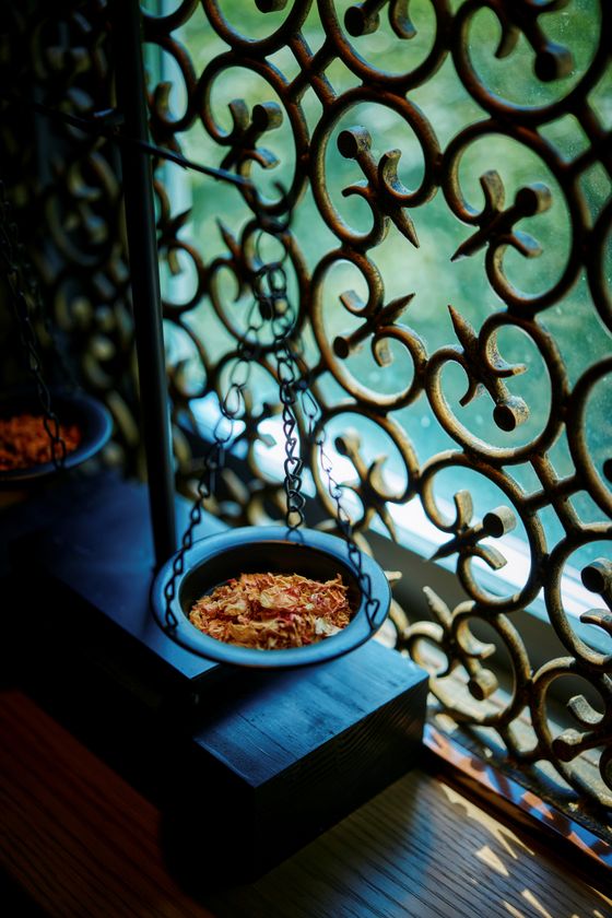 ドライハーブをモチーフにしたシャンデリア、ヨーロッパの伝統美ロートアイアン、園内で収穫したハーブをガラス瓶に収めレイアウトしたハーブセラーなどゆったりとお寛ぎいただける空間です。