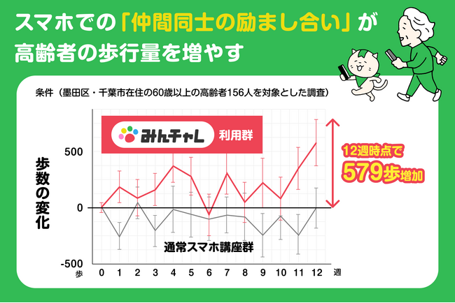 本論文では、墨田区・千葉市在住の60歳以上の高齢者156人を対象としたクラスター無作為化比較試験※が実施されました。その結果、デジタルピアサポートアプリを取り入れたスマートフォン講座を受けた高齢者では、通常のスマートフォン講座のみを受けた高齢者と比べて、12週後の1日平均歩数が約580歩増加することが報告されています。本研究成果は、高齢者の身体活動促進と同時に、デジタル活用を支援する新たな地域介入モデルとして、今後の介護予防施策や自治体のデジタル施策への応用が期待されます。詳細は下記論文をご参照ください。