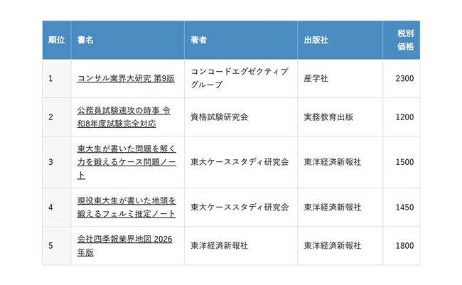株式会社コンコードエグゼクティブグループ(東京都千代田区、代表取締役社長CEO・一橋大学客員教授:渡辺秀和)は、2026年1月15日発売の書籍『コンサル業界大研究 第9版』(渡辺秀和・山越理央 共著、産学社)が、東京大学生協 本郷書籍部の2026年2月度ランキング(就職・公務員部門)において第1位を獲得したことをお知らせいたします。