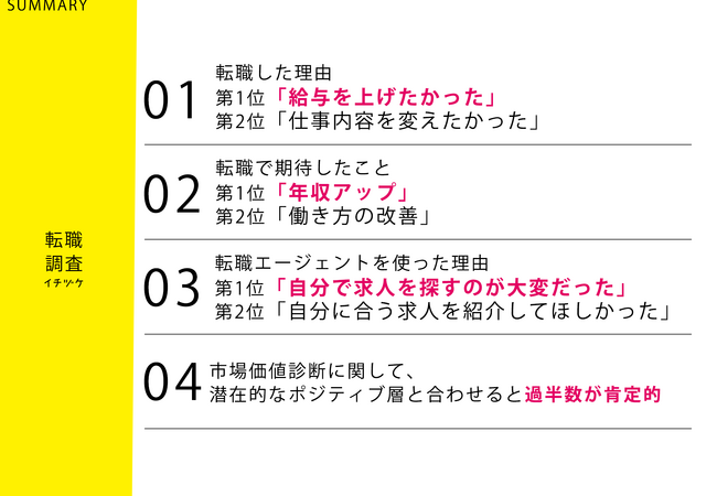 今回は、転職理由や転職エージェントへの評価、市場価値診断に対する意識といった転職に関する調査を実施しましたので、その結果をご紹介いたします。