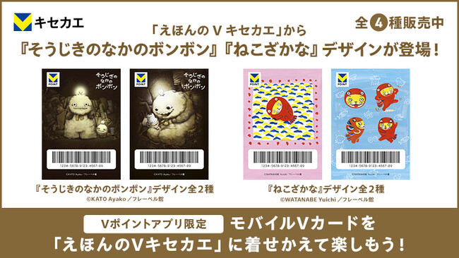 CCCMKホールディングス株式会社(本社:神奈川県横浜市、代表取締役社長兼CEO:高橋 誉則)は、Vポイントアプリの「モバイルVカード」を好きなデザインに着せかえできる「Vキセカエ」(https://ip.tsite.jp/guide)において、人気絵本作家の作品がデザインされた「えほんシリーズ」の第四弾として、『そうじきのなかのボンボン』『ねこざかな』(フレーベル館)のデザイン各2種・計4種類を、2026年3月25日(水)から販売いたします。