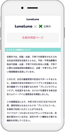 本締結により、生駒市民に対し、当社が提供する、すべての女性の一生に寄り添うウィメンズヘルスケアサービス『ルナルナ』の有料機能である「プレミアムコース」の無償提供を4月1日(水)より開始します。『ルナルナ』のサービスを通じて、不妊治療や妊活に関する基礎知識などの情報配信も予定しており、利用者はライフステージに合わせた健康情報を受け取ることができます。