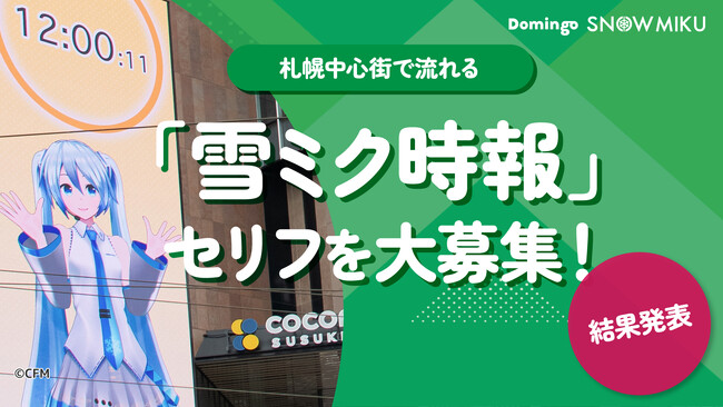 クリプトン・フューチャー・メディア株式会社(本社:北海道札幌市、代表取締役:伊藤博之、以下クリプトン)は、北海道札幌市の複合商業施設「COCONO SUSUKINO(ココノススキノ)」で好評放映中の「雪ミク時報」をリニューアルするにあたり、2026年1月20日(火)~2月16日(月)まで、北海道を応援するキャラクター『雪ミク(初音ミク)』が喋る45文字以内のセリフを一般公募いたしました。