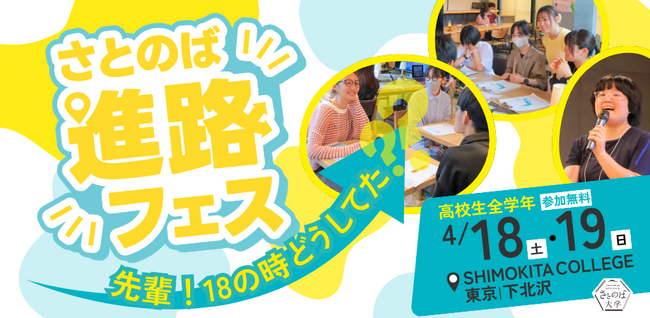 日本全国の地域をキャンパスに「新しい学び方」を提案するさとのば大学(運営:株式会社アスノオト 代表取締役:信岡良亮、所在地:東京都千代田区)は、2026年4月18日(土)・19日(日)の2日間、東京都世田谷区のSHIMOKITA COLLEGEにて、高校生を主対象としたキャリアイベント「進路フェス2026」を開催いたします。昨年、東京・大阪・オンラインで初開催し100名超を動員した本イベントは、今年さらに規模を拡大。教育団体・大学・企業等と連携した「実行委員会形式」へと進化し、学校の枠を超えて「自分らしさ」を見つけ、これからの時代の生き方のヒントが得られる時間を提供します。