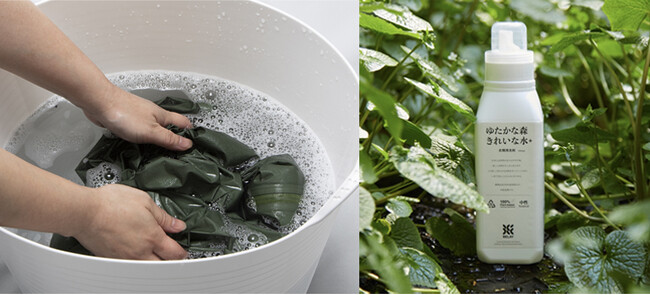 素材本来の機能を長く維持するためには、適切なお手入れが重要であると考えており、2024年より、アウトドア用品専門ECサイトの運営や、オリジナルのサステナブルアウトドアブランド「BELAY」を展開するBELAY株式会社が開発したアウトドア衣類用洗剤「ゆたかな森きれいな水+」の監修に携わり、当社がこれまでモノづくりで培ってきた知見を活かし、性能向上に向けて取り組んできました。
