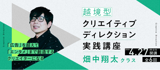 株式会社宣伝会議(本社:東京都港区/代表取締役社長:高橋 智哉)は、2026年4月27日(月)に、「越境型クリエイティブディレクション実践講座 畑中翔太クラス」を開講します。 本講座は、自らのクリエイティビティを広告領域でどう拡張するのか、そしてその”外”の世界へどう拡張するのか。肩書きに頼らないクリエイターを目指す実践型講座です。