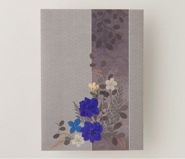静謐(せいひつ)なグレーを基調とした和風の台紙に、優美な印象の紫と青のおし花をあしらいました。