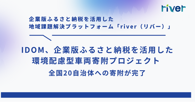 株式会社カルティブ(本社:神奈川県横浜市、代表取締役:池田 清)は、当社が運営する企業版ふるさと納税を活用した地域課題解決プラットフォーム「river(リバー)」において、株式会社IDOM(本社:東京都千代田区、代表取締役社長:羽鳥 由宇介)が実施した環境配慮型車両の寄附プロジェクトについて、全国20自治体への寄附が完了したことをお知らせいたします。