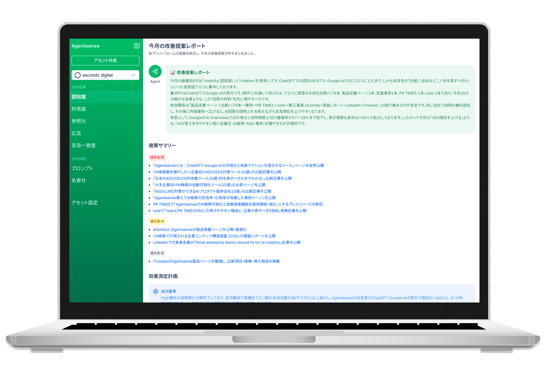 AI検索時代における企業やサービスの見え方を可視化し、改善につなげるAI検索プラットフォーム「secondz Agentsense」を提供しています。生成AI上での認識や参照状況の把握から、改善提案までを支援しています。