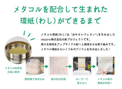 mizuiroは、本技術の社会実装に向けて、素材を“体験できるプロダクト”へと展開する役割を担っています。metacol(TM)を配合した紙素材「環紙(わし)」を開発し、