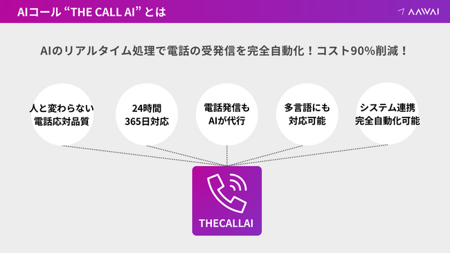 AAWAI株式会社(本社:東京都渋谷区、代表取締役:村澤 秀明)は、AIによるリアルタイム音声処理で電話の受発信を完全自動化するAIコール「THE CALL AI」の提供を開始しました。