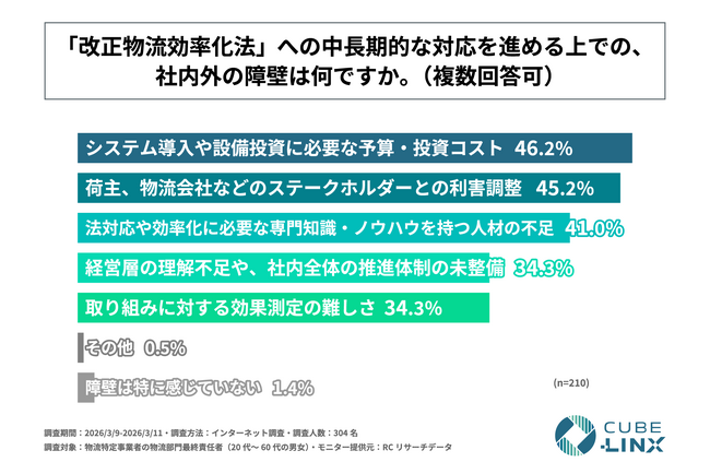 物流特定事業者による改正物流効率化法への中長期的対応の最大障壁は「システム導入や設備投資に必要な予算・投資コスト」!株式会社CUBE-LINXが「改正物流効率化法への対応実態に関する調査」を実施!