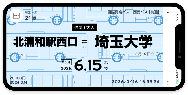 国際興業(株)(本社:東京都中央区、代表取締役社長:黒滝 寛)と西武バス(株)(本社:埼玉県所沢市、代表取締役社長:塚田 正敏)は、2026年4月1日(水)から、埼玉大学線においてRYDE株式会社(本社:東京都渋谷区、代表取締役:杉崎 正哉)が提供するデジタル乗車券アプリ 「RYDEライド PASSパス」*1に対応したデジタル定期券の販売を開始いたします。