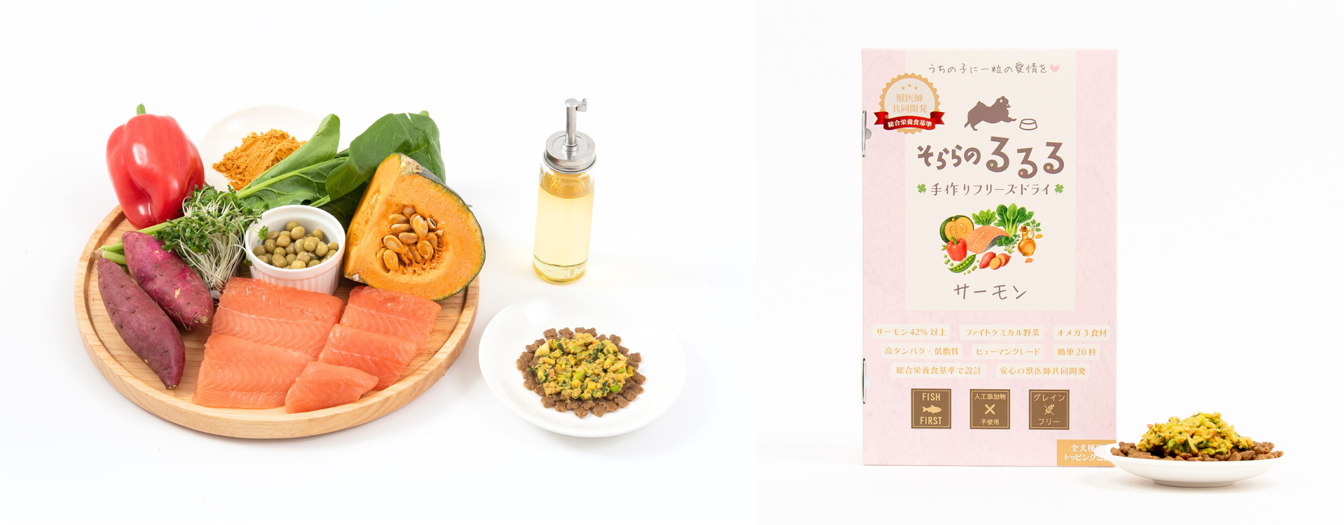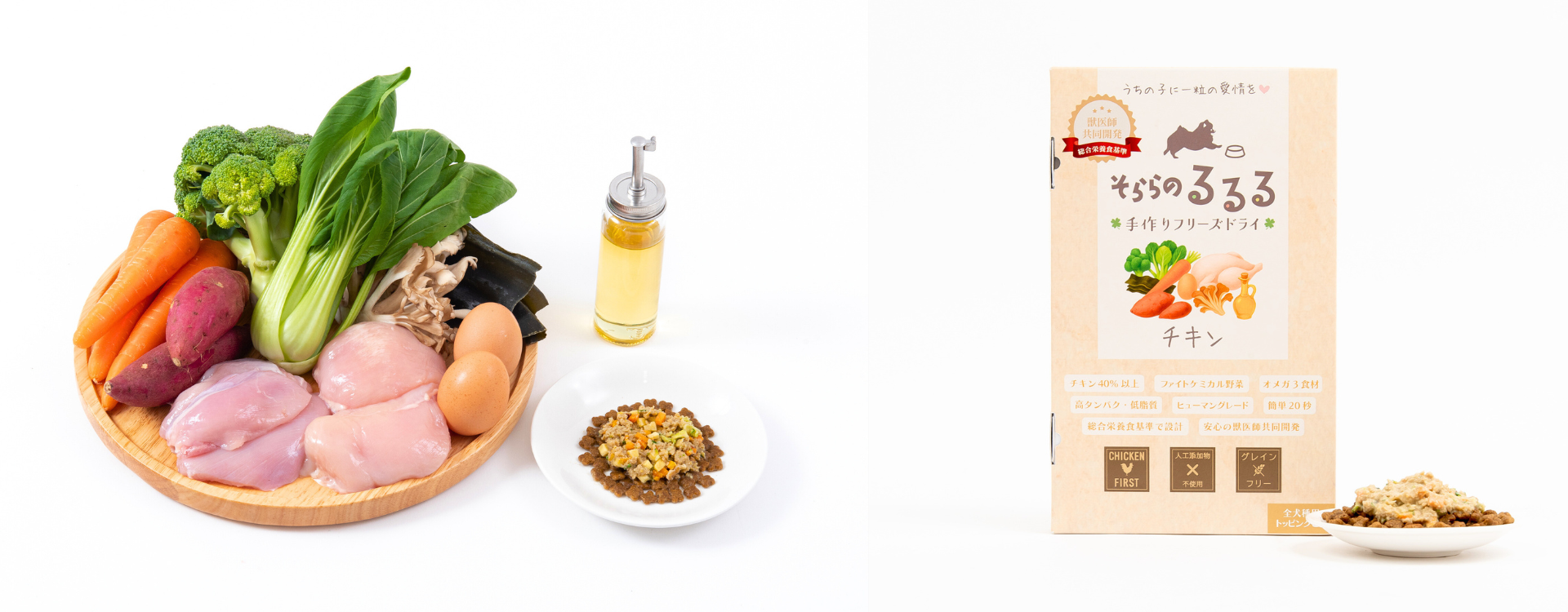 愛犬の空(そら)くんが1歳頃からドライフードを食べなくなり、フード探しに悩む中で出会ったのが「手作りごはん」でした。目を輝かせて完食してくれた時の喜び、さらに涙焼けまで綺麗になった感動が本商品作りの原点です。「なぜ犬の食事は乾燥したフードが当たり前なのか?」という疑問から、家族と同じように温かい食事を楽しんでほしいと一念発起。毎日の手作りは難しい忙しい飼い主様でも手軽に取り入れられる、新しい「愛情の選択肢」として誕生しました。“誰でも・いつでも・どこでも、手作りの美味しさを再現できるごはん”、それが「そららのるるる」です。