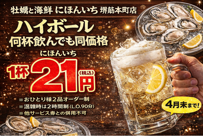 ハイボール1杯21円。何杯飲んでも同価格|牡蠣と海鮮 にほんいち 堺筋本町店