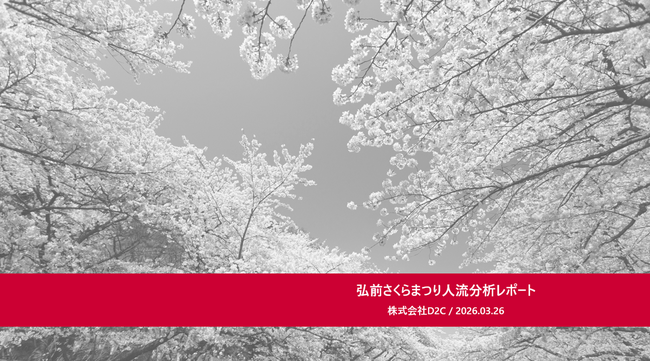 株式会社 D2C(本社:東京都港区、代表取締役社長:岡 勇基、以下D2C)は、株式会社NTTドコモ(以下ドコモ)が保有する1億超(※1)の会員基盤をベースにしたドコモデータ(※2)を活用し、2025年4月16日から5月5日まで開催された「弘前さくらまつり」の来場者属性や人流を詳細に分析したレポートを公開いたしました。