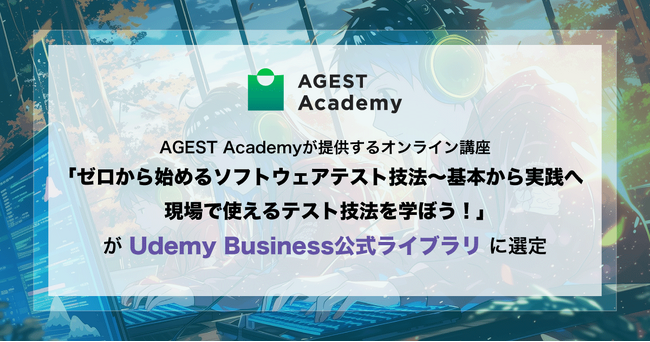 先端品質テクノロジーを活用してソフトウェアの品質・安全性向上を支援する株式会社AGEST(本社: 東京都文京区、代表取締役 社長 執行役員 CEO: 二宮 康真、以下、「AGEST」)は、当社のエンジニア教育・育成機関であるAGEST Academyが提供するオンライン講座「ゼロから始めるソフトウェアテスト技法~基本から実践へ 現場で使えるテスト技法を学ぼう!」が、世界最大級のオンライン学習プラットフォーム「Udemy」の法人向け定額サービス「Udemy Business」の公式ライブラリに選定されたことをお知らせいたします。